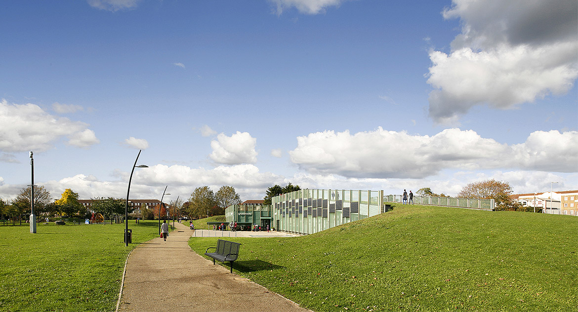 The objective of the design team at Eger Architects - led by Toni Yli-Suvanto - was to develop both environmentally and economically sustainable building, with a positive impact on social wellbeing and security for the Newham community as well as the wider neighbourhood. The project converts the Memorial Park located in the centre of the community from an unused physical and physiological barrier into an active and secure site of social cohesion.